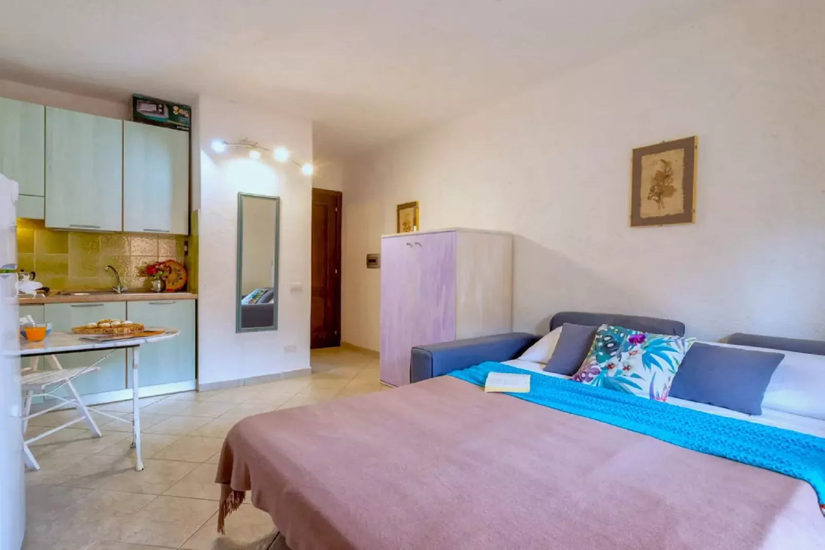 Dieses gemütliche Studio für 2 Personen bietet einen komfortablen und funktionalen Wohnraum mit einem Wohnzimmer mit offener Küchenzeile, ausgestattet mit Herd, Kühlschrank mit Gefrierfach und allen wichtigen Dingen für Ihren Aufenthalt. Der Wohnbereich umfasst außerdem ein Doppelschlafsofa, einen Fernseher und einen Esstisch für Mahlzeiten und zum Entspannen.