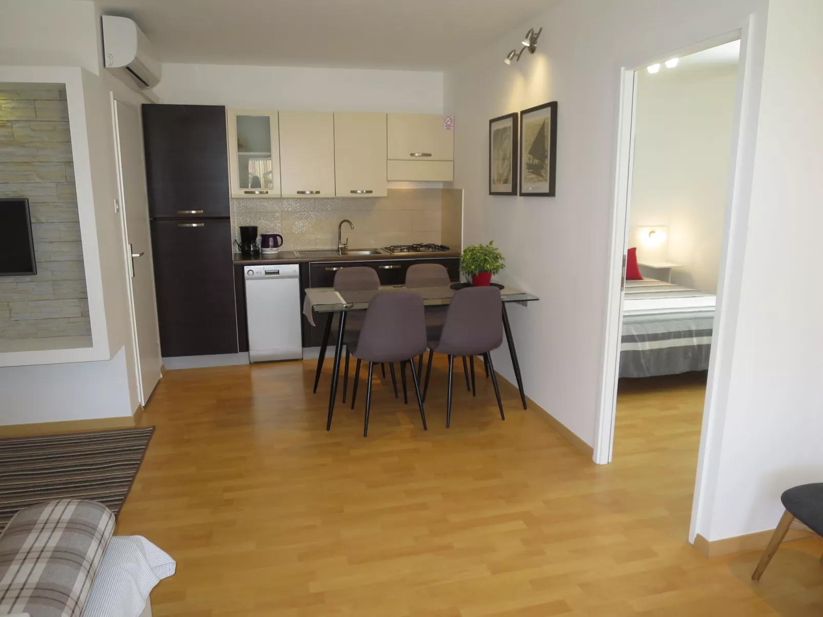 "Tome", 2-Zimmer-Wohnung 37 m2 im 1. Stock. Wohn-/Esszimmer mit 1 Diwanbett, Sat-TV und Klimaanlage. Ausgang zum Balkon. 1 Zimmer mit 1 franz. Bett (160 cm, Länge 200 cm). Offene Küche (Geschirrspüler, 2 Induktionskochplatten, Toaster, Wasserkocher, Mikrowelle, Tiefkühler, elektrische Kaffeemaschine). Dusche/WC. Keine Heizmöglichkeit. Balkon 7 m2. Balkonmöbel. Zur Verfügung: Internet (Wireless LAN, gratis). Bitte beachten: Nichtraucher-Haus. Eigener Eingang.