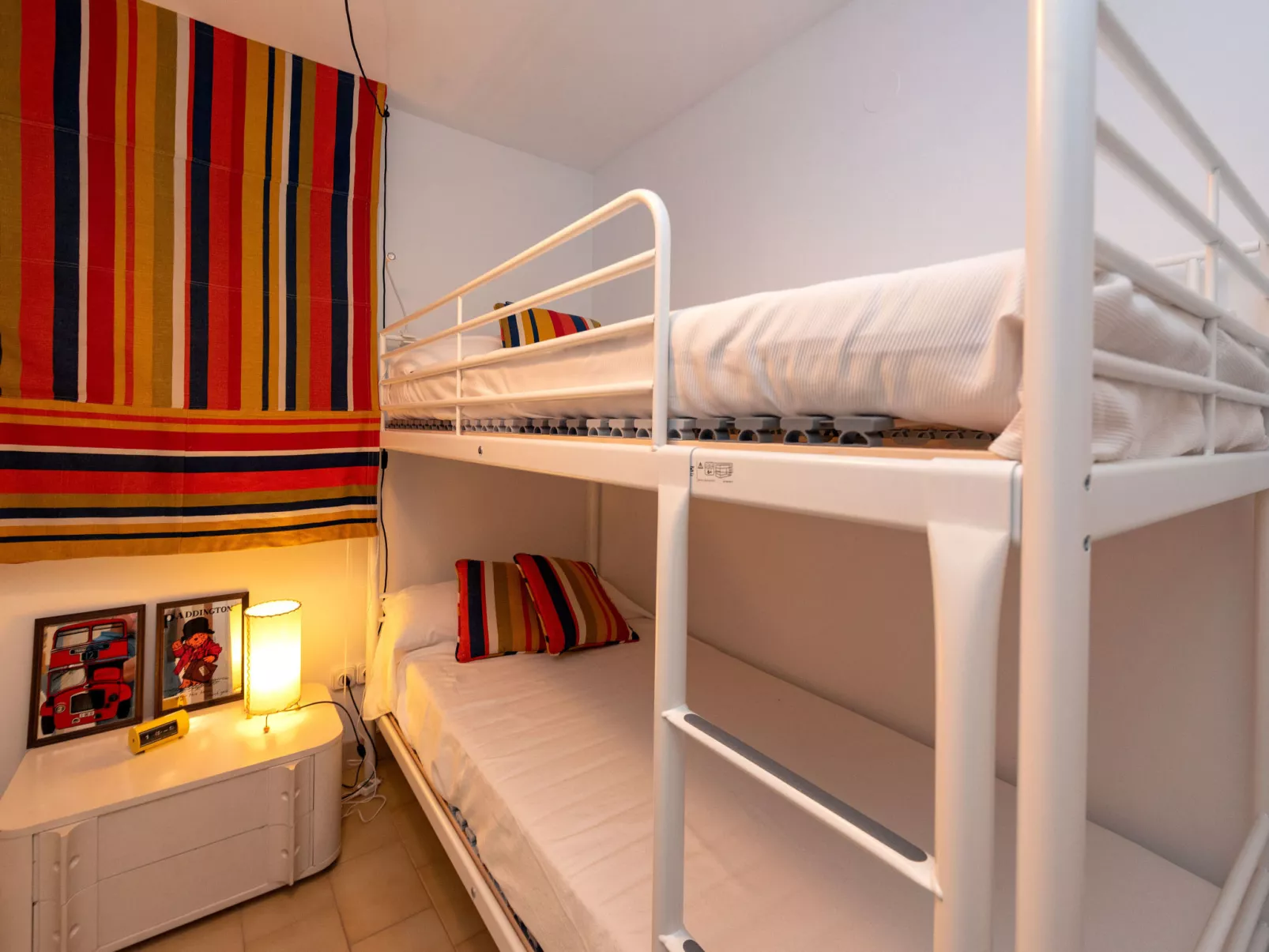 "Acuario", 4-room apartment 85 m2. Comfortable furnishings: living/dining room with dining table and digital TV. Exit to the balcony. 1 room with 1 french bed (135 cm, length 190 cm). 1 room with 2 beds (90 cm, length 200 cm). Exit to the balcony. 1 room with 1 x 2 bunk beds (90 cm, length 200 cm). Kitchen (3 hot plates, oven, dishwasher, microwave, freezer). Bath/WC, bath/bidet/WC. No heating option. Balcony. Balcony furniture. Very beautiful view of the sea. Facilities: washing machine, iron, hair dryer. Internet (WiFi, free). Parking. Suitable for families. HUTB036653
