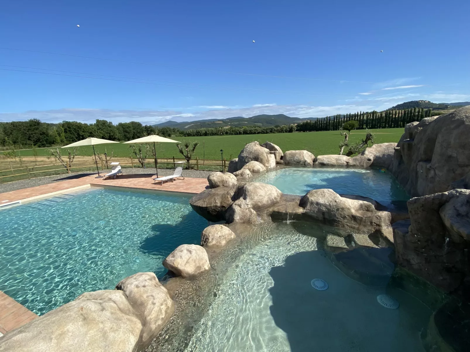 This carefully restored complex is located in the middle of the fields of the Val di Cecina, a few steps from the river of the same name. Much attention was paid to the construction of the swimming pool, where a hydromassage ( about 11 people) and a children's pool carved into the stone were created. Resort "Podere la Querciola", 2 storeys, renovated in 2021, surrounded by meadows and fields. In the district of Casino di Terra 11 km from the centre of Guardistallo, 14 km from the centre of Cecina, in a secluded, quiet position, 16 km from the sea. For shared use: property with plants and trees, swimming pool (6 x 11 m, depth 150 cm, seasonal availability: 01.May. - 15.Oct.). Children's pool, outdoor shower, hot tub, garden furniture, barbecue. In the complex: WiFi, washing machine (extra). Motor access (700 m via unmade road). Parking. Shop 11 km, restaurant 2 km, bar 2 km, bus stop 1.1 km, sandy beach "Marina di Cecina" 16 km. Nearby attractions: Volterra 24 km, Pisa 70 km, Firenze 100 m.
