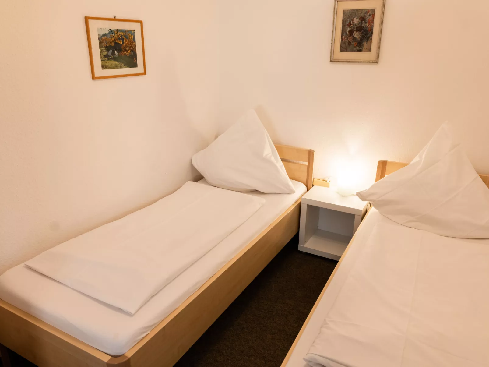 "Weitblick (F 112)", 2-room apartment 54 m2 on 4th floor. Beautiful furnishings: living/dining room with 1 sofabed and satellite TV (flat screen), radio. Alcove with curtain with 2 beds (80 cm, length 200 cm). 1 room with 1 double bed (2 x 90 cm, length 200 cm). Kitchenette (oven, 4 ceramic glass hob hotplates, toaster, kettle, electric coffee machine). Bath/WC. Balcony. Balcony furniture. Facilities: telephone, children's high chair (extra). Internet (WiFi, free). Parking (1 car) at the house. Please note: non-smokers only. The balcony is glazed. Bookings accepted for holiday purposes only. Instead of an enclosed bedroom, some sleeping areas are located in an open-plan area (gallery, alcove, etc.).