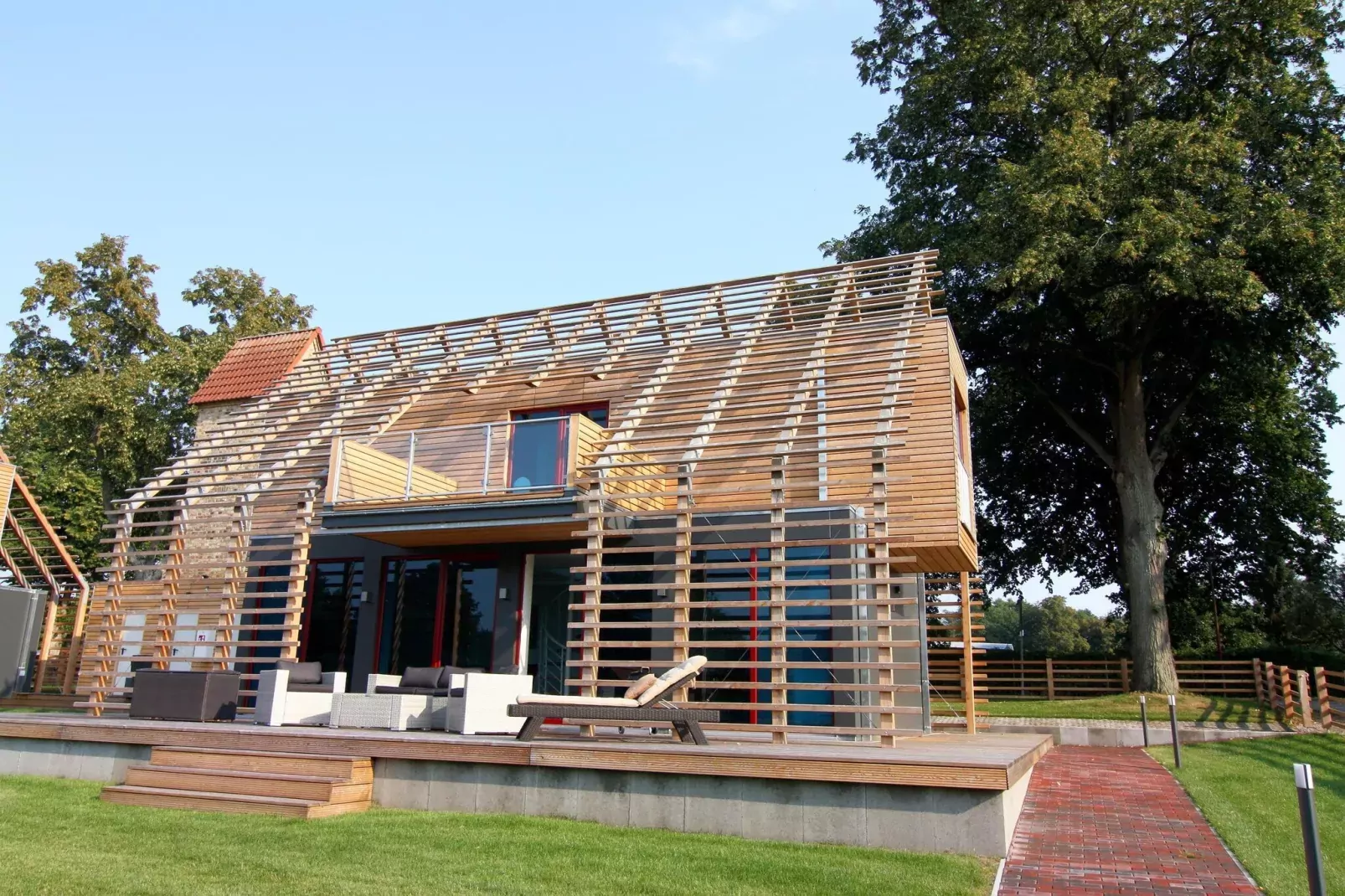Exclusive and newly built 2019 chalet over 2 floors on the grounds of Schlosshotel Wendorf near Schwerin, modern and innovative. With 80 square metres of living space and extremely comfortable and modern furnishings, the domicile is a true oasis of well-being. The living area with electric fireplace provides a cosy ambience. Enjoy your time out on the large balcony as well as on the inviting terrace. Breakfast and dinner are available for a fee at the Schlosshotel, which is only 100 metres away. You also have the opportunity to improve your handicap on the nearby golf course. There is also a professional riding facility at the foot of the castle park.