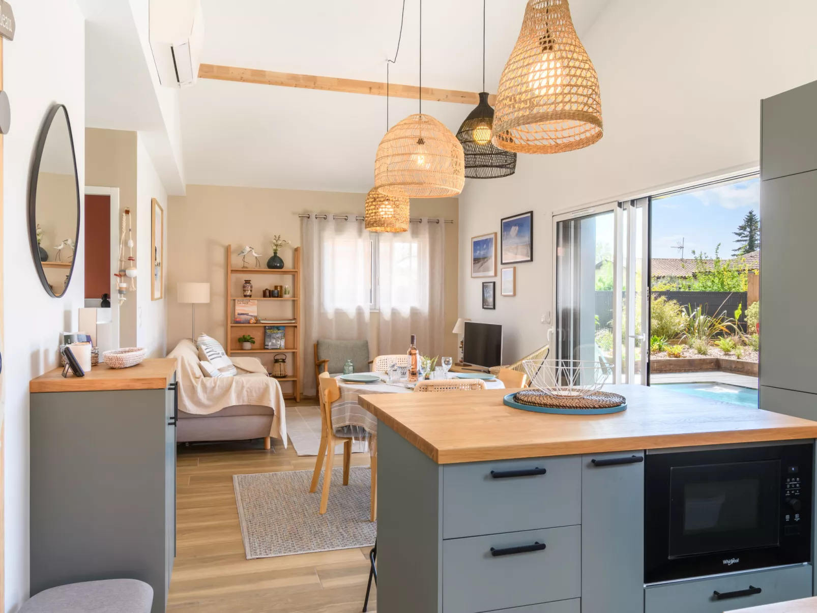 La Teste De Buch 5 km from Arcachon: Modern, beautiful single-family house "La Belle Testerine", built in 2022. 5 km from the sea, 5 km from the beach. Private: property 380 m2 (fenced), swimming pool (5 x 3 m, depth 140 cm, seasonal availability: 01.Jun. - 15.Sep.) with internal staircase and alarm system. Boules, parking. Grocery 1.8 km, supermarket 1.7 km, shopping centre 2 km, restaurant 800 m, bar 2.4 km, bakery 1.9 km, bus stop "La Séouge" 450 m, railway station "Le Teste de Buch" 2.5 km, sandy beach "La Hume" 5 km, park "La Chêneraie" 4.2 km, thermal baths "Thalazur" 6.4 km. Sports harbour 2.5 km, golf course (18 hole) 3.6 km. Nearby attractions: Dune du Pyla 6.7 km, Eratopia 5.1 km, Marché Municipal 1.7 km, Cinéma Grand Ecran 2.3 km, Navette Maritime pour le Cap Ferret 5.8 km, ArcaJetMarine 5.1 km. Well-known lakes can easily be reached: Lac de la Magdeleine 6.4 km, Lac de Cazaux 11.9 km. The keys‘ handover takes place by the agency Interhome in Arcachon, 6 km. Neighbourhood highly sensitive to noise. Quietness and good behaviour expected.