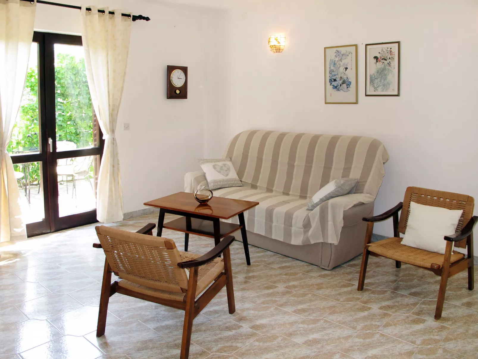 4-room house 100 m2 on 2 levels. Living/dining room with satellite TV and air conditioning. Exit to the terrace. 1 room with 1 french bed. Kitchen (4 hot plates, oven, dishwasher, toaster, kettle, microwave, freezer, electric coffee machine). Bath/bidet/WC. Upper floor: 1 room with 2 beds, 1 folding bed and air conditioning. Exit to the balcony. 1 room with 2 beds and air conditioning. Balcony, terrace 25 m2 partly roofed. Deck chairs. Facilities: Internet (WiFi, free). Please note: non-smoking house. Maximum 3 pets/ dogs allowed. Klasa: UP/I-335-03/20-01/2310, Urbroj: 2163/1-10/2