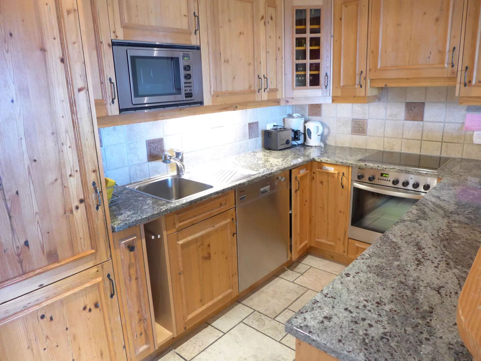 "Résidence Le Chalet 5", 2-room apartment 68 m2 on 1st floor. Object suitable for 2 adults + 2 children. Very comfortable furnishings: living/dining room with panoramic window south facing position with 1 sofabed (140 cm, length 200 cm), open-hearth fireplace, cable TV and electric shutters. Exit to the balcony. 1 room with 1 double bed (2 x 90 cm, length 190 cm). Exit to the balcony. Kitchen-/living room (oven, dishwasher, 4 ceramic glass hob hotplates, toaster, kettle, microwave, freezer, electric coffee machine, Capsules for coffee machine (Nespresso) extra, raclette grill) with bar. Bath/WC, shower/WC. Large balcony 15 m2, south facing position. Balcony furniture. Very beautiful view of the mountains. Facilities: iron, hair dryer. Internet (WiFi, free). Garage space n G (1 car), height 213 cm, width 239 cm. Please note: non-smokers only.
