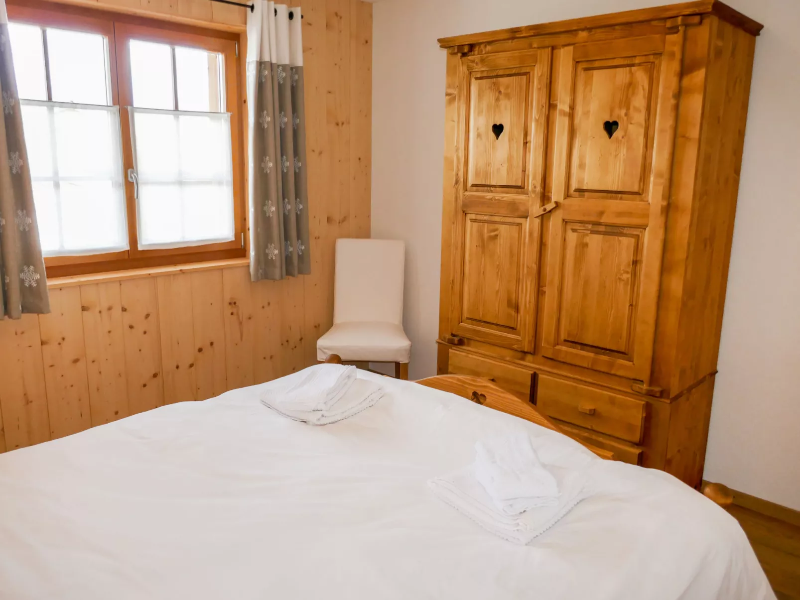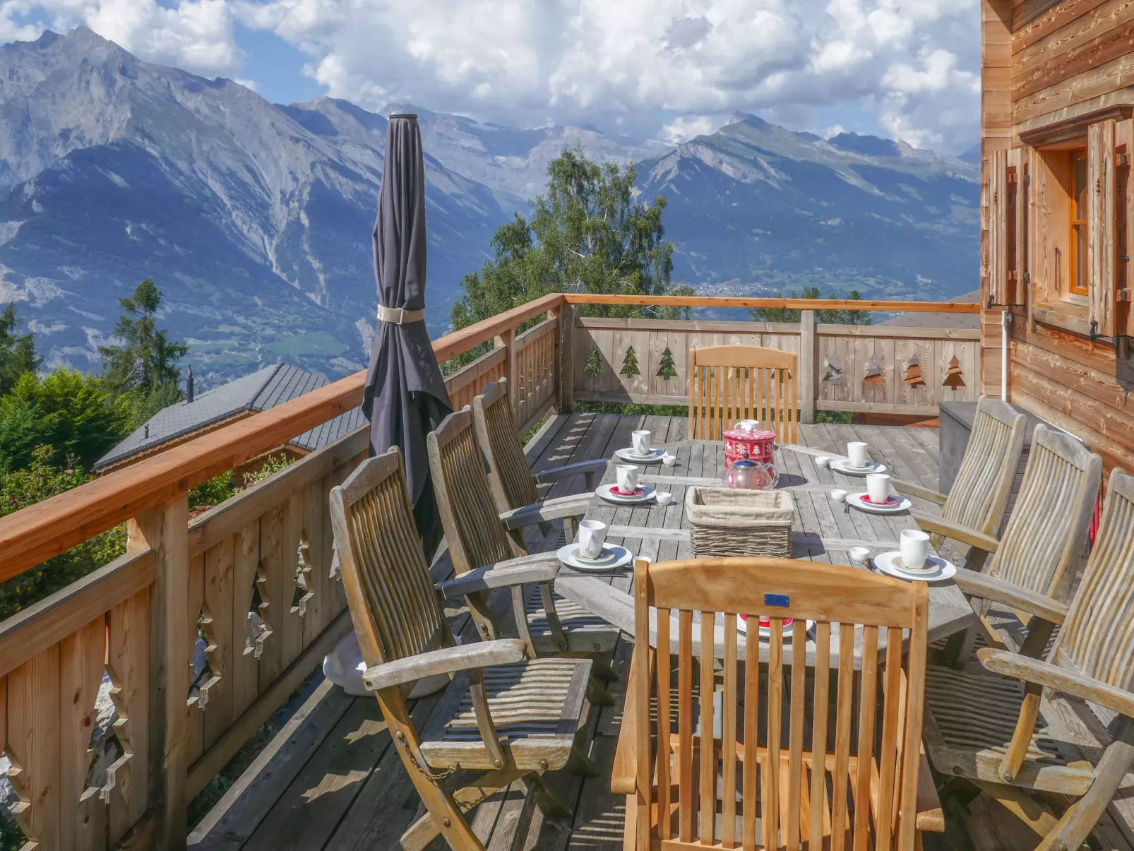 "Le Muveran V8", 5-room chalet 184 m2 on 3 levels. Spacious and bright, beautiful and tasteful furnishings: entrance hall. Living/dining room with open-hearth fireplace, cable TV and radio. Exit to the balcony, to the terrace, north facing position and west facing position. Open kitchen (oven, dishwasher, 4 ceramic glass hob hotplates, toaster, kettle, microwave, electric coffee machine, Capsules for coffee machine (nespresso) extra, raclette grill, fondue Set (chinoise, cheese)). Sep. WC. Heating. On the lower ground floor: entrance hall. 1 room with 1 french bed (160 cm, length 200 cm). 1 room with 2 beds (90 cm, length 200 cm). Shower/WC. Upper floor: 1 room with 1 french bed (160 cm, length 200 cm). Exit to the balcony, north facing position. 1 room with 2 beds (90 cm, length 200 cm). Exit to the balcony, north facing position. Bath/shower/WC. Balcony, north facing position terrace 27 m2, west facing position, garden, south facing position. Terrace furniture, barbecue, deck chairs (2). Very beautiful view of the mountains. Facilities: washing machine, dryer, children's high chair, baby cot, hair dryer. Internet (WiFi, free). Parking (3 cars). Please note: non-smokers only.