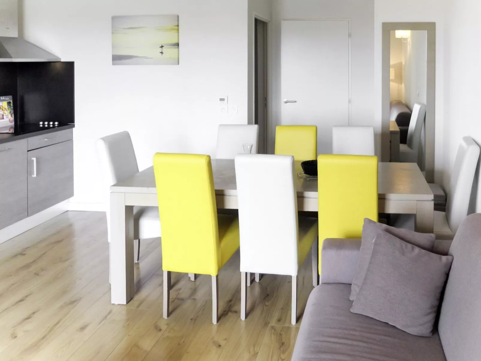 "Les Balcons de l’Océan", 3-room apartment 50 to 60 m2. Bright, cosy furnishings: living/sleeping room with 1 double sofabed, dining table and TV. Exit to the balcony, to the terrace. Alcove with 2 beds. 2 rooms, each room with 2 sleeping facilities. Kitchenette (dishwasher, 2 ceramic glass hob hotplates, combination microwave). Exit to the balcony, to the terrace. Bath/WC, shower, sep. WC. Electric heating. Balcony or terrace. Facilities: children's high chair, baby cot (extra). Internet (WiFi, extra). Please note: maximum 2 pets/ dogs allowed. Smoke alarm, fire extinguisher. Alternatively, the flat can be on 2 floors, in this case the bedrooms and bathroom/WC are on the upper level. Instead of an enclosed bedroom, some sleeping areas are located in an open-plan area (gallery, alcove, etc.).