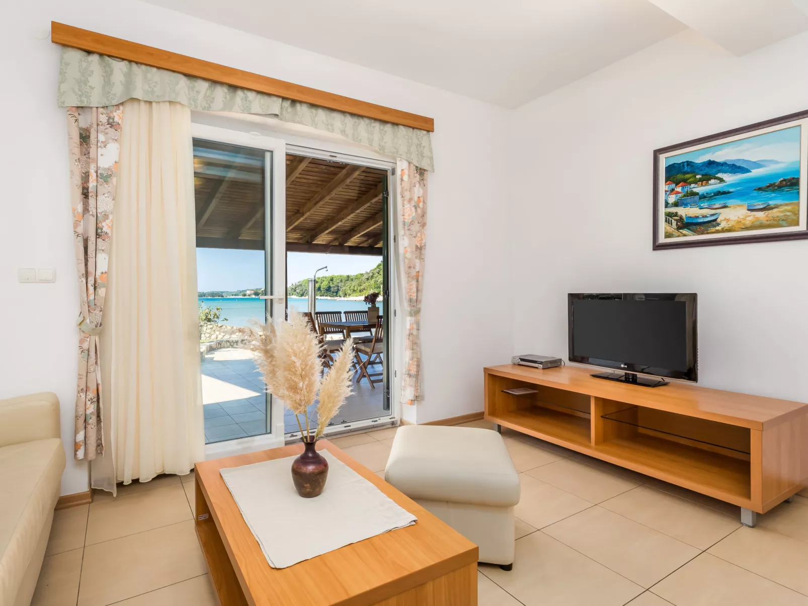 "Mare 1", 3-room apartment 50 m2, on the ground floor. Beautiful and modern furnishings: living/dining room 28 m2 with 1 double sofabed, satellite TV and air conditioning. Exit to the terrace. 1 room with 1 double bed (160 cm, length 200 cm). Exit to the terrace. 1 room with 1 x 2 bunk beds. Open kitchen (4 hot plates, oven, dishwasher, microwave, freezer). Shower/WC. Large terrace 25 m2, roofed, terrace 4 m2, roofed. Terrace furniture, deck chairs. Beautiful view of the sea. Facilities: safe. Internet (WiFi, free). Parking.