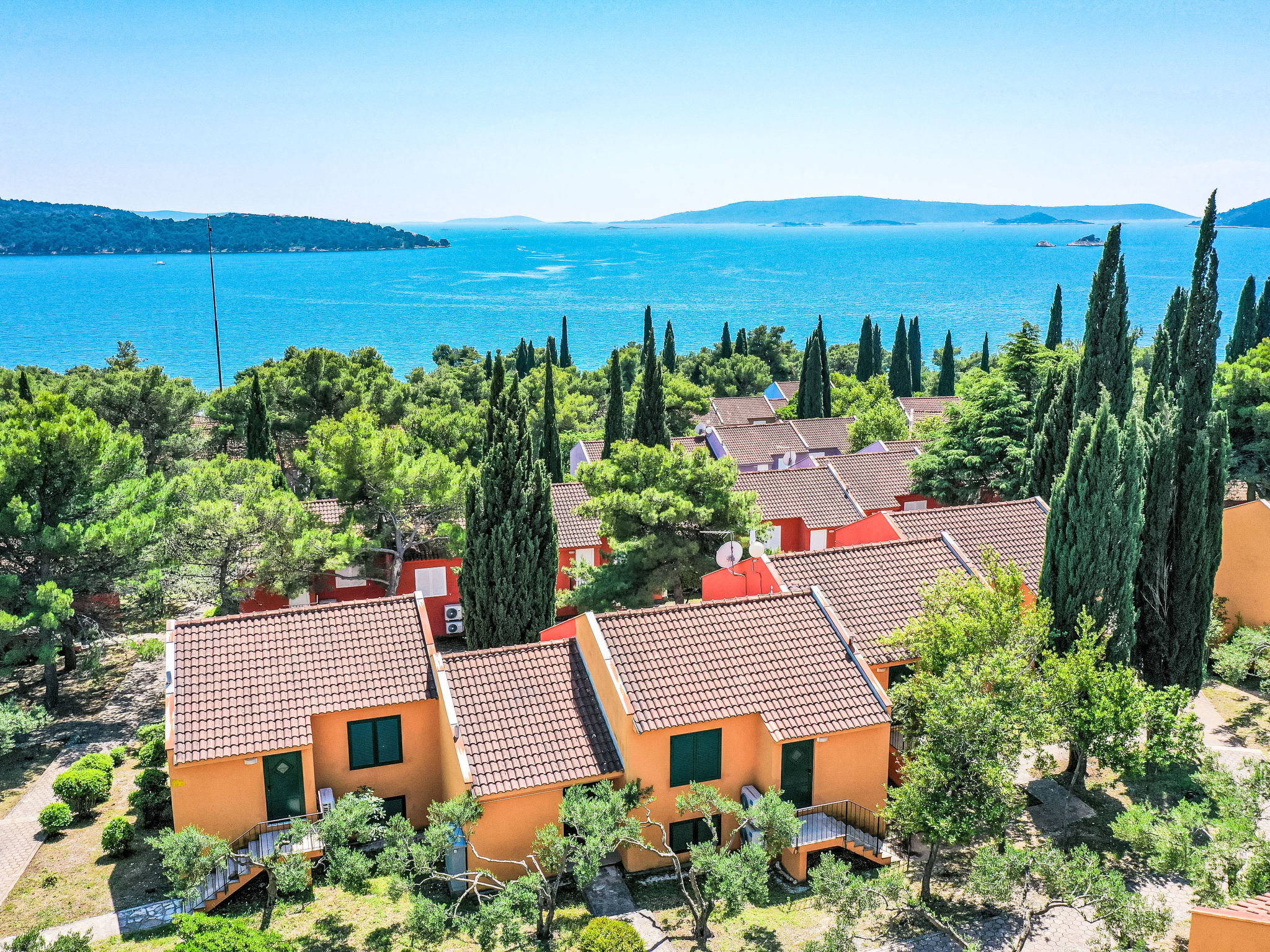 Resort "Medena". In the district of Seget Donji 3 km from the centre of Trogir, 30 km from the centre of Split, at the seaside, on the beach. For shared use: property with plants and trees, 3 swimming pools (31 m2, depth 140 cm, seasonal availability: 01.Apr. - 01.Nov.) with internal staircase. Children's pool, outdoor shower, tennis (extra), basketball (extra), children's playground. In the complex: reception, restaurant, internet access, laundry. Available: bicycles (extra). Breakfast full board half board possible on request (extra). Airport transfer (extra). Parking (extra) on the premises. Bus stop 650 m, pebble beach "Medena". Object suitable for 2 adults + 2 children. Please note: airfield 8 km from the property. The photograph shows a typical example. 1 double sofabed in living/dining area is only for 2 children up to 12 years old. For shared use mini golf and cageball court (on request, extra).