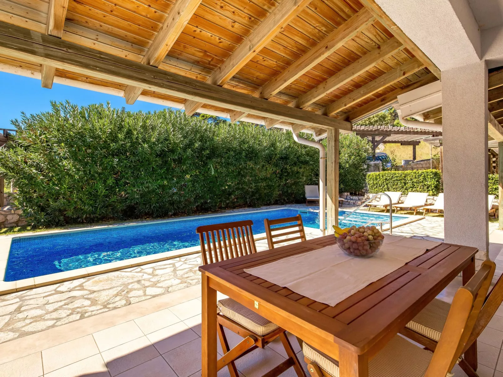 Beautiful apartment block. In the district of Palit 2 km from the centre of Rab, outside the resort, in a sunny, elevated position, 100 m from the sea, 250 m from the beach. For shared use: property (fenced), well-kept garden with lawn, swimming pool angular heated (9 x 4 m, depth 120 - 160 cm, seasonal availability: 13.May. - 30.Sep.) with internal staircase. Children's pool, outdoor shower, garden furniture, barbecue. In the house: internet access. Roofed, parking at the house. Shop 900 m, restaurant 1 km, bus stop 1.9 km, sandy beach, pebble beach 250 m, public bathing area 900 m. Tennis 2.5 km. Please note: the photograph shows a typical example. Additional accommodations can be booked. Property ref. HR3700.301, 304 is situated on the same property. The apartment house "Mihaela" is situated on the same grounds (1600 m2) with apartment houses "Ivan" and "Pavica", with swimming pool for shared use, with counterflow. One part of the pool is a paddling pool, depth 30 - 60cm. Deck chairs at disposal. The old town of Rab can be reached by a coastal promenade (20 minutes walk).