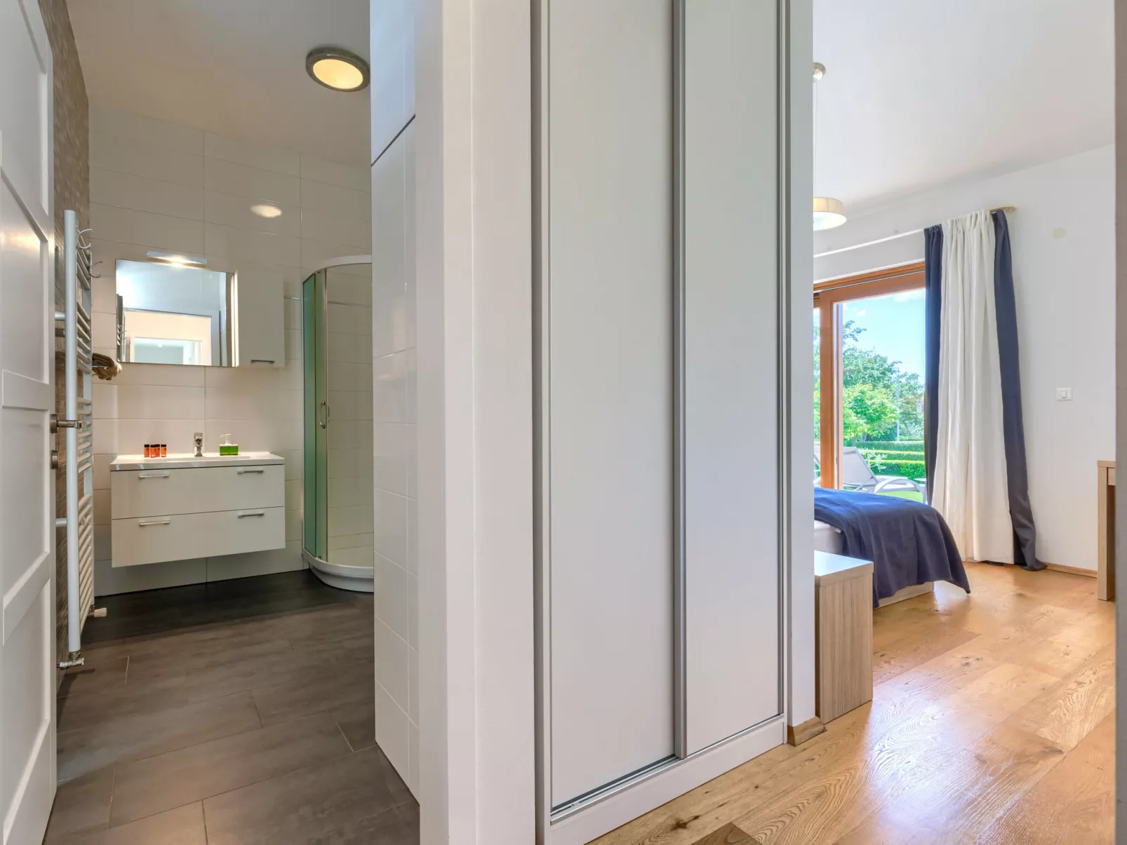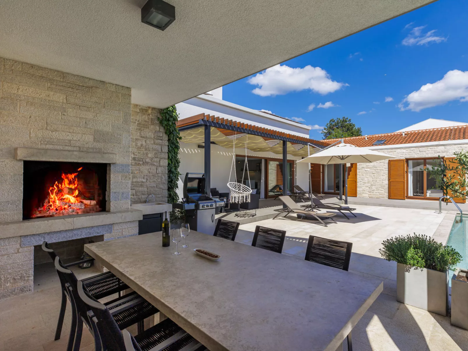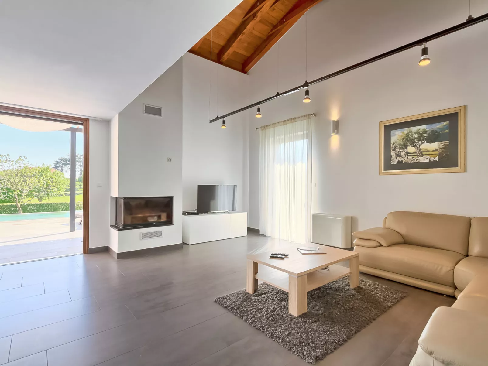 Modern villa "Terra Nera". 4 km from the centre of Žminj, 13 km from the centre of Pazin, in a quiet, sunny position, 27 km from the sea. Private: property 1'228 m2, beautiful, well-kept garden with lawn, swimming pool angular (9 x 4 m, depth 140 cm, seasonal availability: 01.Jan. - 31.Dec.) with internal staircase. Outdoor shower, terrace (18 m2), garden furniture, barbecue. In the house: internet access, washing machine, tumble dryer. Roofed, parking (for 2 cars) at the house on the premises. Shop 100 m, supermarket 6 km, restaurant 1 km, café 500 m, bus stop 6.9 km, railway station 500 m, pebble beach 27 km. Riding stable 2 km, walking paths from the house 1 km, cycle lane 1 km. Groups of teenagers on request only. Massage 500 m.