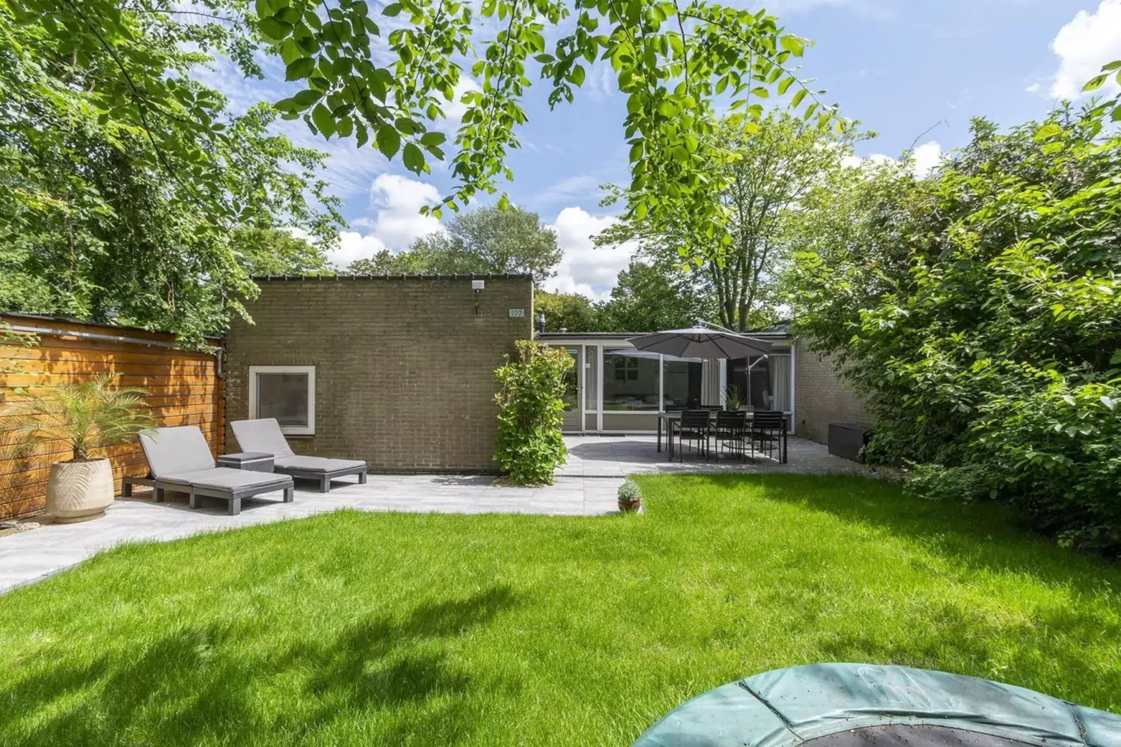 Sur la terrasse abritée, vous pourrez profiter tôt des premiers rayons de soleil pendant que les enfants s'amuseront sur le trampoline au fond du jardin.
