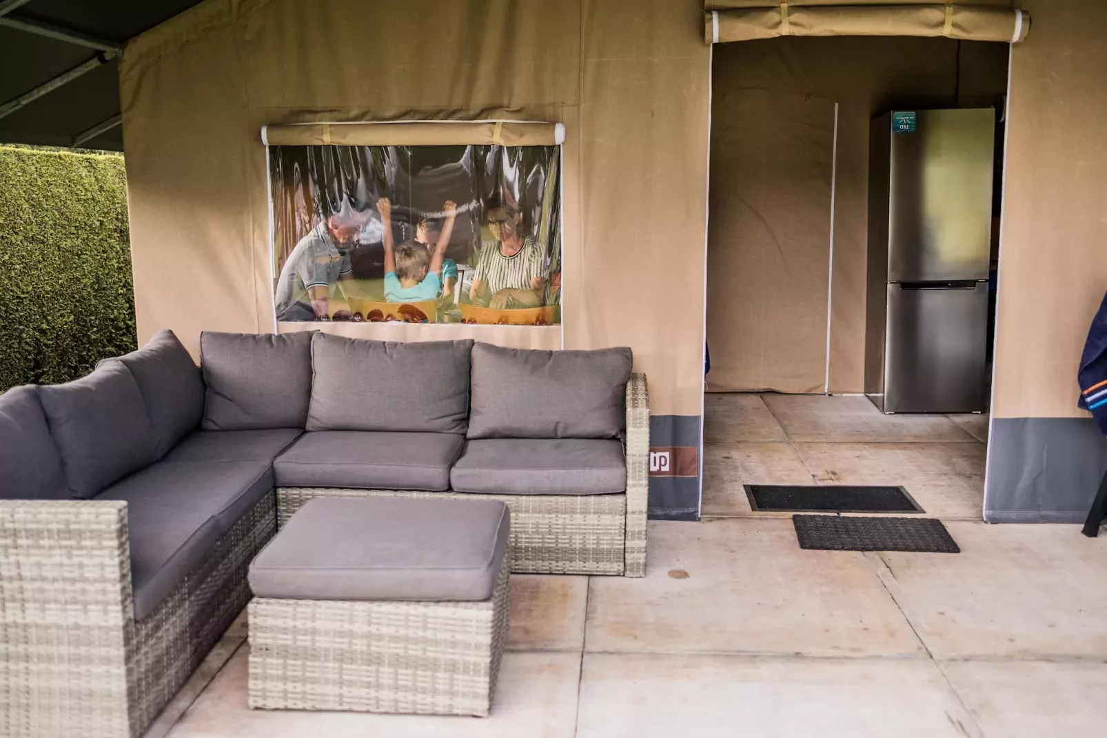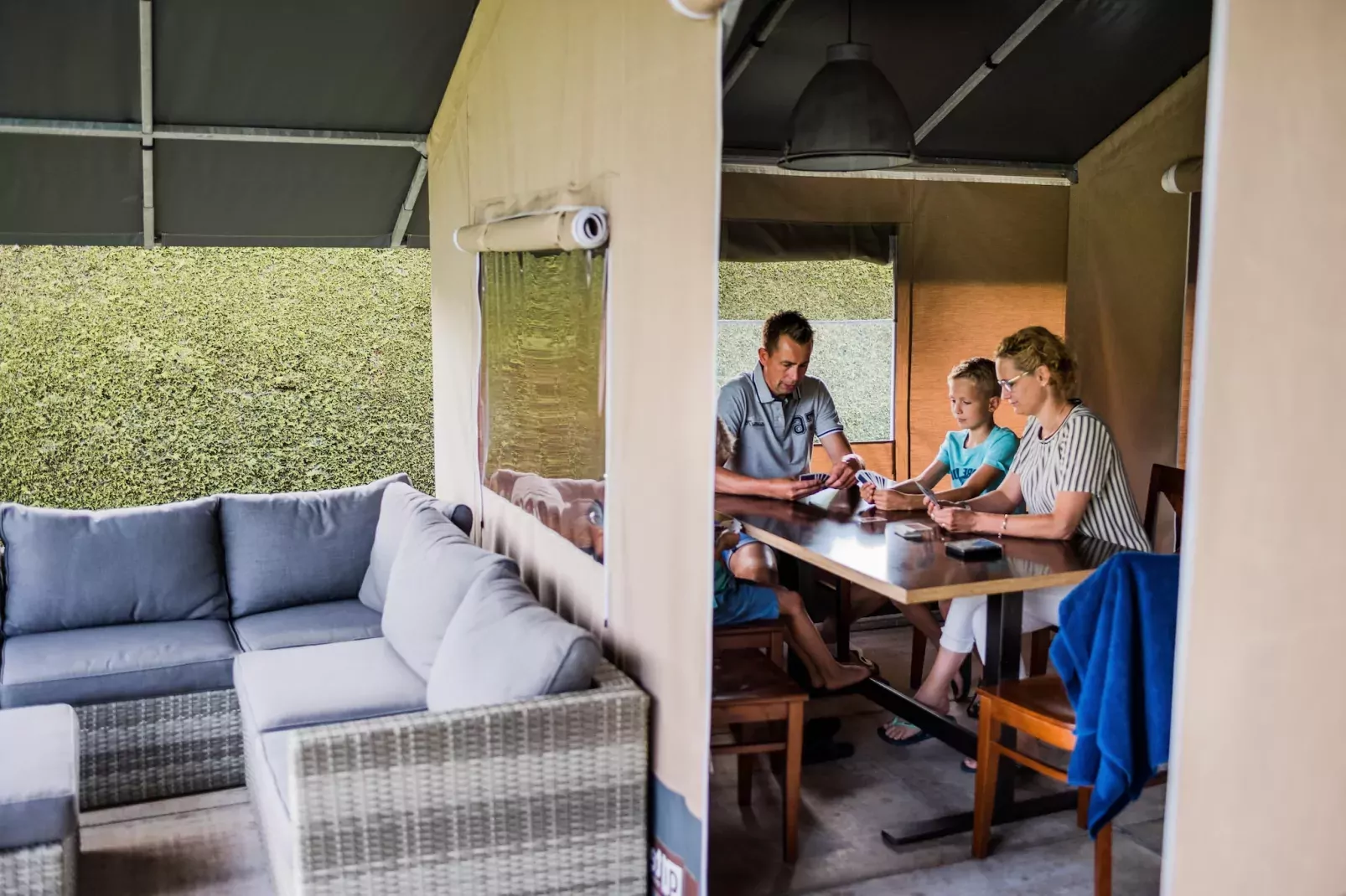 La tente safari est confortable, douillette et entièrement meublée. Vous y découvrirez la vraie sensation du camping, mais avec le confort d'une maison de vacances. Vous disposerez d'un salon avec une cuisine ouverte équipée d'un réfrigérateur-congélateur et d'une cuisinière. Il y a trois chambres à coucher, dont deux avec deux lits simples éventuellement assemblés en lit double, et une chambre avec un lit simple. La tente safari dispose d'une salle de bains privative avec douche et toilettes.